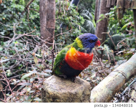 Vibrantly colored rainbow lorikeet parrot perched on a small tree branch, showcasing its bright green, blue, red, and yellow feathers in a natural outdoor setting