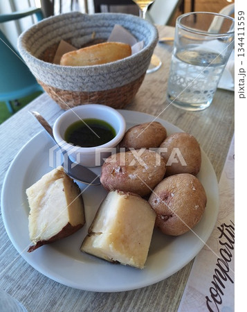 Traditional Canarias potatoes served with green sauce. Typical Canary Islands cuisine concept, Spanish food culture, and local gastronomy. Sweet potato.