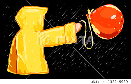 Vector illustration of a person in yellow raincoat giving a red balloon. Atmospheric concept art in minimal style