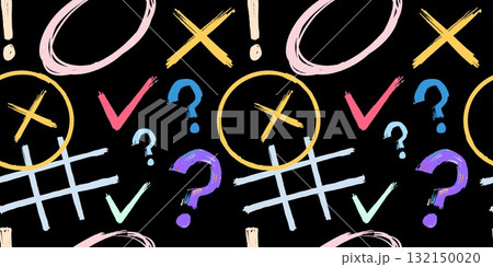 Colorful graphic pattern with crosses, notes, and question marks on a dark background. Decorative abstract composition with playful graffiti mood.