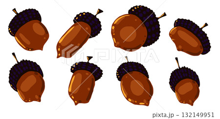 Vector illustration of brown acorns collection. Hand drawn autumn nuts isolated on white background