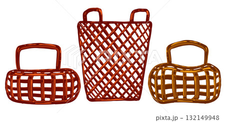 Vector illustration of woven picnic baskets. Hand drawn wicker storage set isolated on white background