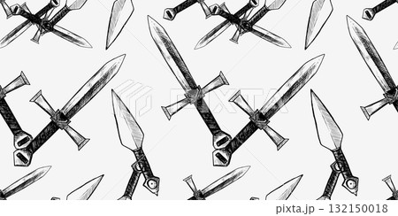 Seamless vector pattern of knives arranged diagonally, black and white sketch style, symbolizing weapons, danger, and edgy decoration.