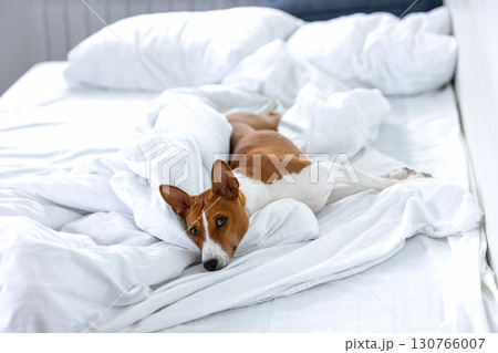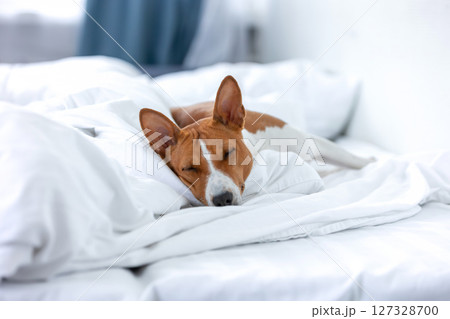 Basenji dog sleeping in owner's bed on white sheet