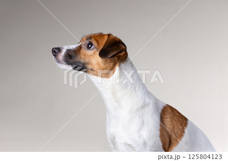Close-up portrait of a dog looking intently at the upper left corner. Jack Russell Terrier on a light background.