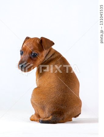 A red-haired miniature pinscher puppy sits with its back turned to the camera. isolated on a white background