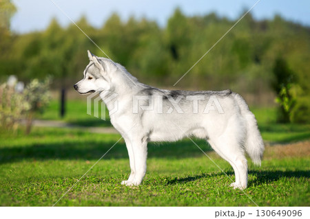 Portrait of a breed Siberian Husky standing in the summer on a green lawn
