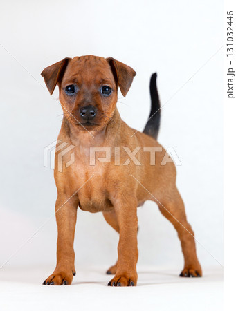 A red, one-and-a-half-month-old miniature pinscher puppy isolated on a white background. High quality photo