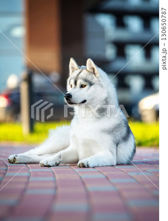 Portrait of Siberian Husky lying on red paving stones with building in background.