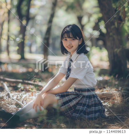 學生坐在森林裡
