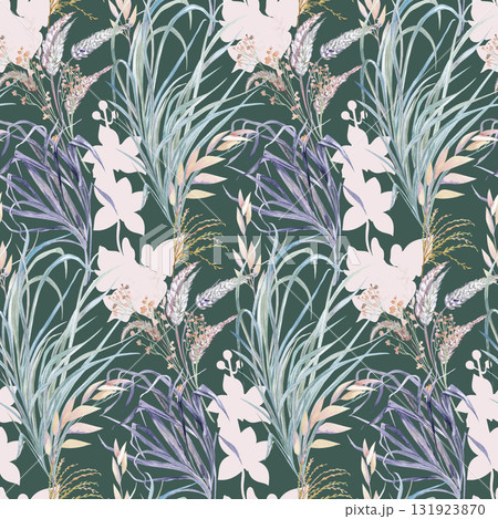 Seamless watercolor pattern with graceful herbs and flowers with leaves