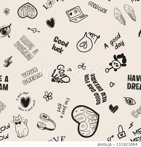 Seamless pattern for teenage girls with inscriptions and sketches in vector for textiles