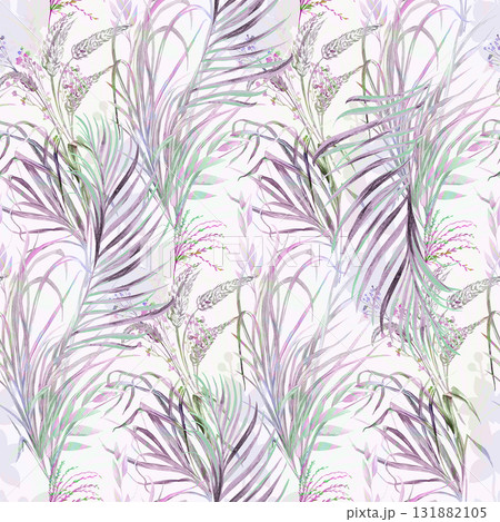 Watercolor seamless pattern in boho style with botanical composition of dried flowers with palm leaves
