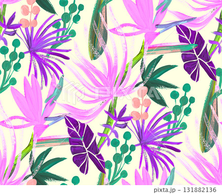 bright seamless pattern with multicolored tropical flowers and leaves painted in drybrush gouache