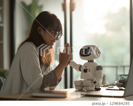 一位日本年輕女子微笑著與人工智慧機器人交談