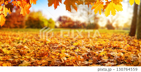 orange fall leaves in forest, autumn natural field background with blurred bokeh and sun rays