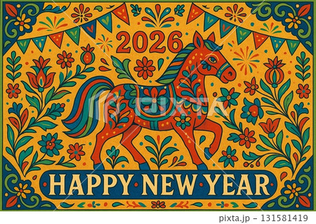 2026年馬年慶祝人物馬和新年裝飾新年賀卡