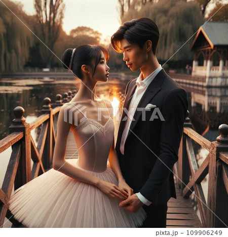 一名芭蕾舞者和一名男子在橋上對視。它也可以用於婚禮。