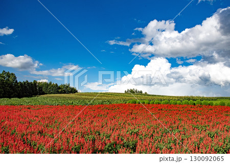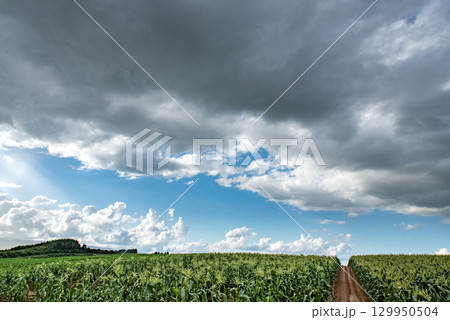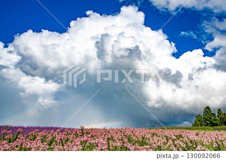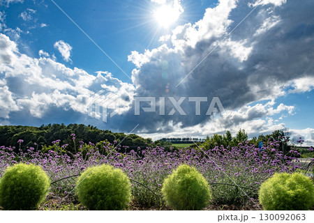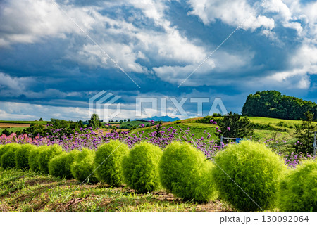 陽光照射下的藜蘆、馬鞭草和陰雲密佈的天空下的山丘