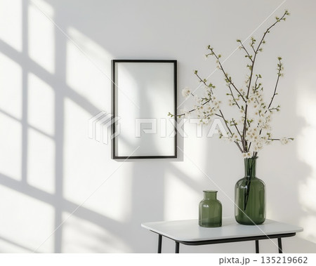 Minimal interior with empty picture frame and vases in sunlight