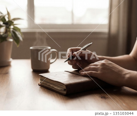 Morning journaling with coffee by bright window