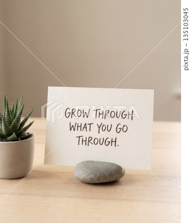 Motivational quote card with succulent and stone on minimalist desk