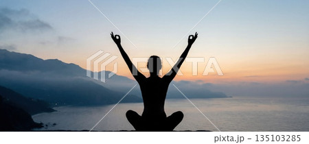 Silhouette meditating on seaside cliff at sunset