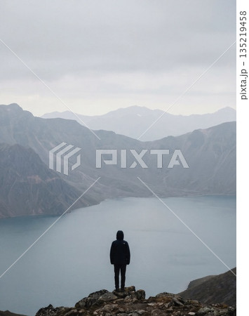 Hiker standing on cliff above mountain lake in fog