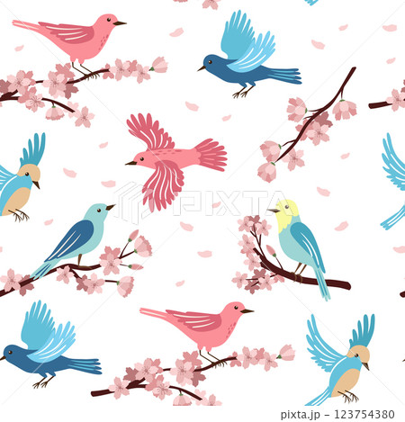 Spring birds and flowering branches. Colorful cute seamless pattern for printing on wallpaper, wrapping paper, textile on other surfaces.