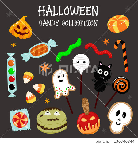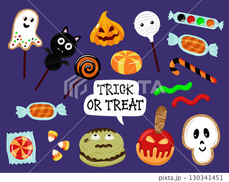 Halloween sweet treat candy set. Cake, lollipop, marmalade, cookie in the shape of scary characters. Cute ghost, scull, pumpkin, bat, etc.