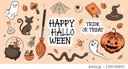 Happy Halloween banner template. Witch magic icons set - broom, cauldron, snake, hat, potion, cat. Jack O Lantern and ghosts.