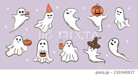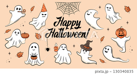 Set of cute ghost posters. Happy Halloween holiday card collection. Vector illustration. Retro style