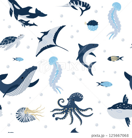 Ocean animals seamless pattern. Underwater creatures. Inhabitants of the sea world. Blue color vector background for packaging, fabric, wallpaper, paper