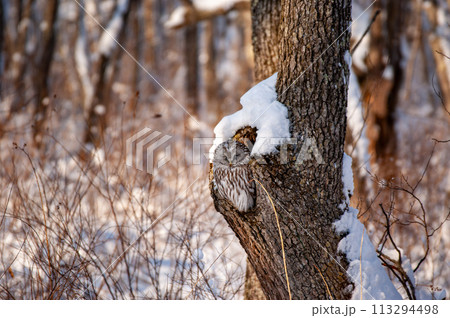 丹頂鶴從被霜覆蓋的樹木包圍的棲息地起飛