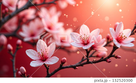 盛開的櫻花和紅色背景,前往日本,觀光階段,方形布,寬闊的公告海報告材料背景片
