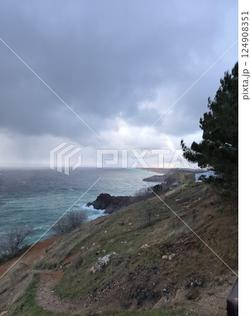 Rocky coastline with grassy cliffs under a cloudy sky, waves crash against the shore. Pine tree on the right providing a natural frame to the scenic ocean view
