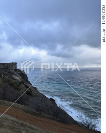 Dramatic sky with large grey clouds above choppy ocean waves, viewed from a grassy cliff edge. The sea has a gradient of colors from deep blue to lighter teal near the shore