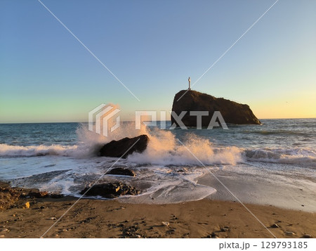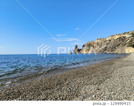 Majestic rocky cliff formation under a clear blue sky at a coastal location during daytime exploration