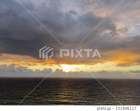 Dramatic sunset over the ocean with stormy clouds. Golden sunlight breaking through the dark sky and reflecting on the water