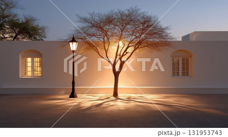 Golden light illuminates a bare tree and street lamp at dusk, casting dramatic shadows on the paved courtyard