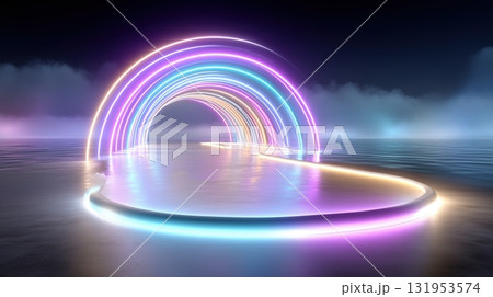 Vibrant neon archway over a reflective surface, leading into a futuristic abstract tunnel of light
