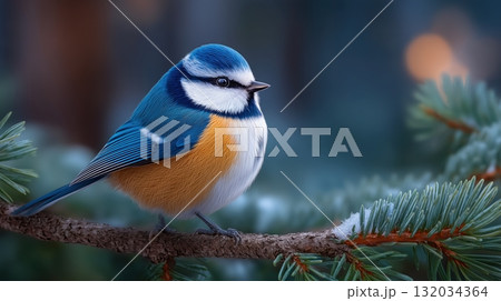 Vibrant blue tit bird perched on a snowy pine branch in winter