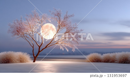 Magical Winter Night with a Frost-Kissed Tree and Glowing Full Moon
