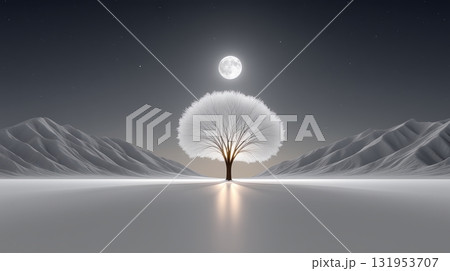 Solitary frosted tree glowing under a full moon in a serene winter mountain landscape.
