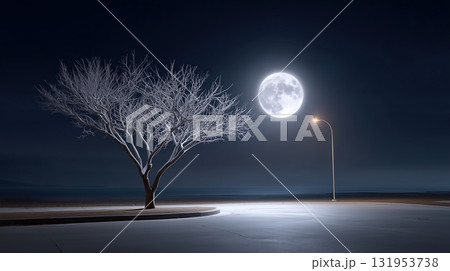 Full Moon Over Winter Tree and Streetlight by the Ocean at Night