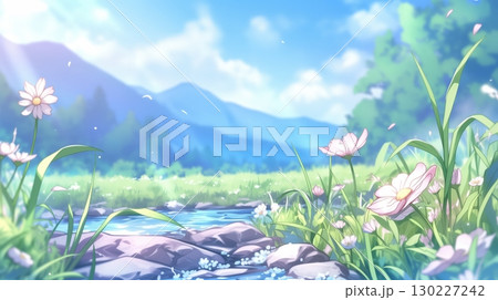 Serene Mountain Stream with Wildflowers on a Sunny Day