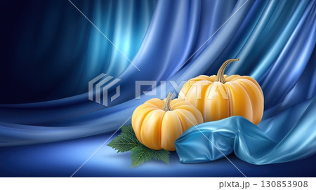 Two Golden Pumpkins on Elegant Blue Satin Drapes for Autumn
