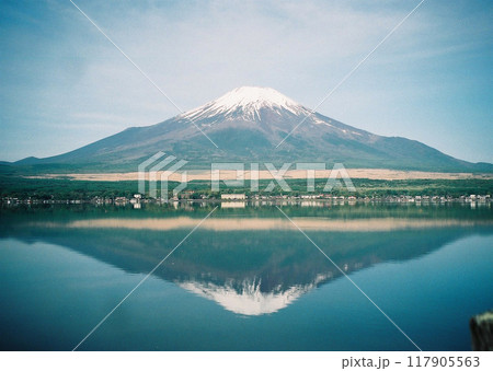 從山中湖看到晴朗的天空和倒置的富士山