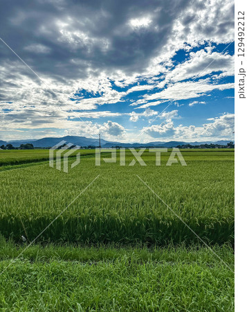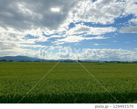 一張鄉村風景照片,有夏日的天空、雲彩和稻穗