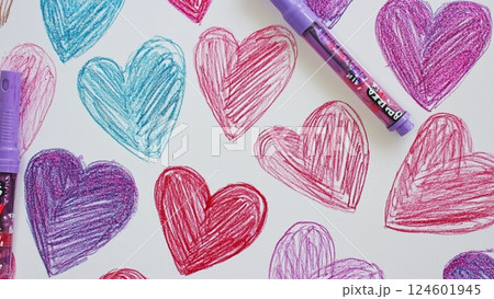 Colorful Hand Drawn Hearts Background Glitter Crayon Art for Valentine's